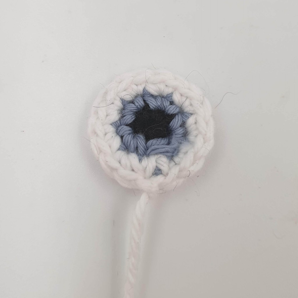 Attach the eye to the front, centre of the upper body using a yarn needle (or even a glue gun if you have). Using pins, fix the horns to the head. Take a little time as the positioning can really change the look. Once you are happy, attach. In the pictures they are attached between Rnd 3 and 4.